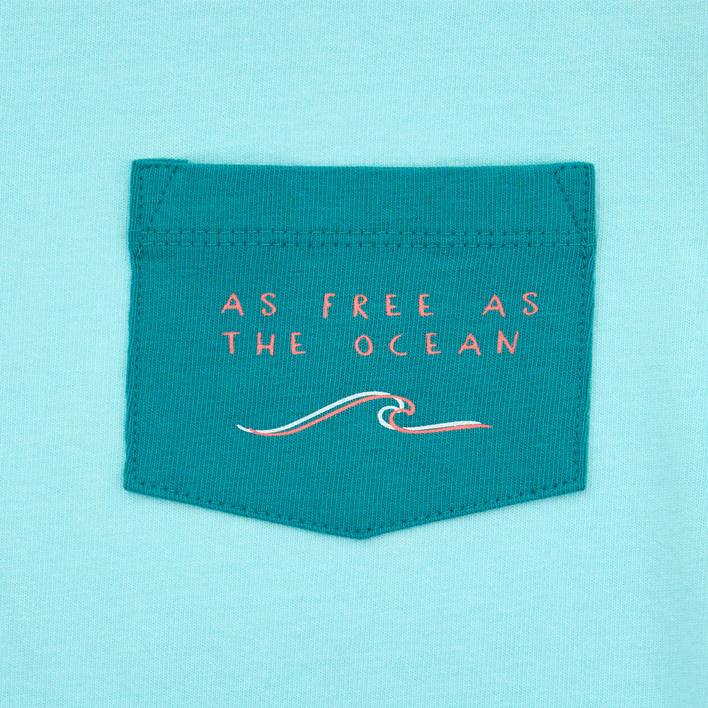 Camiseta junior confeccionada con tejido 100% algodón 180 gramos. Esta camiseta de manga corta, básica y con cuello redondo que cuenta con un bolsillo en el pecho con el texto " As free as Ocean" y un dibujo de olas.