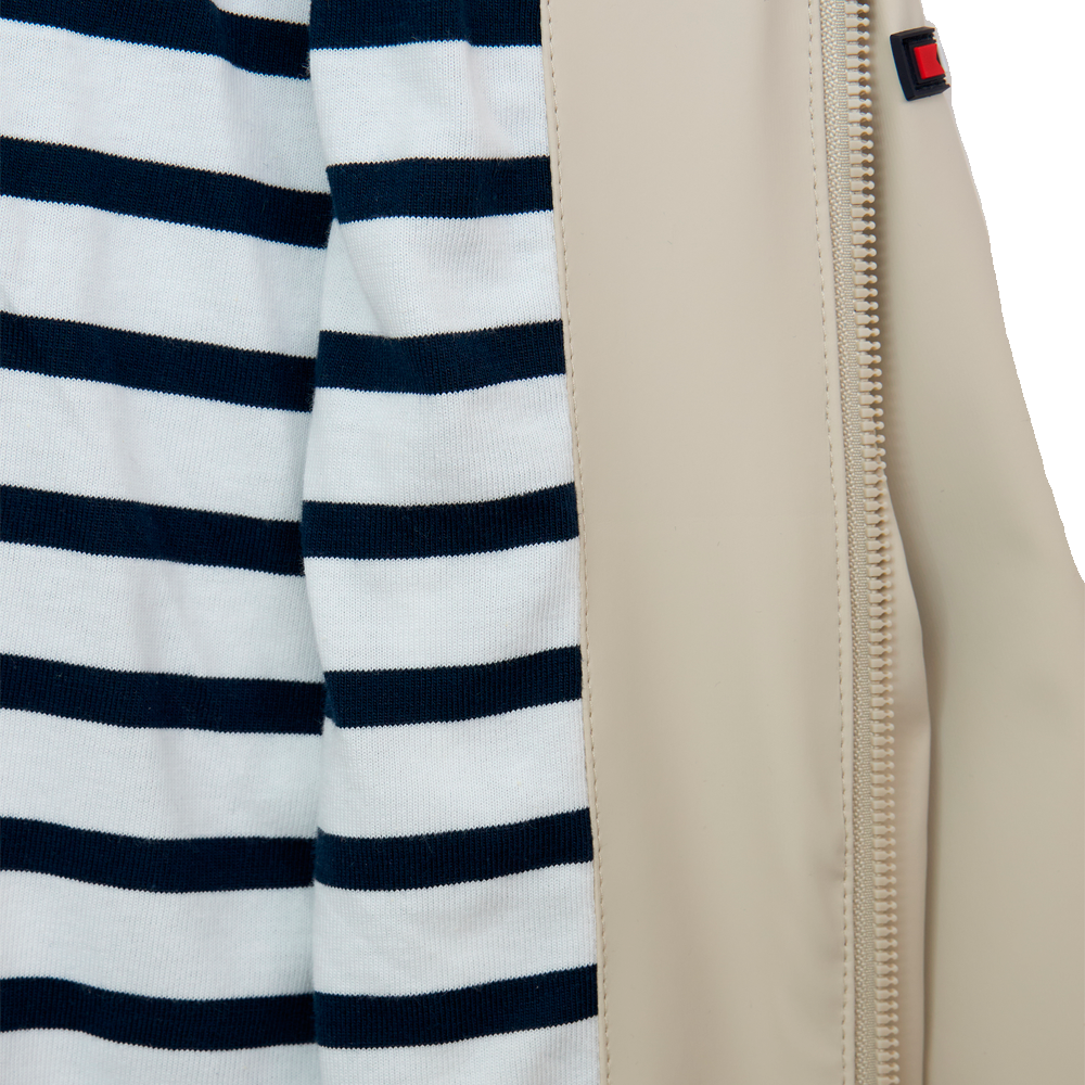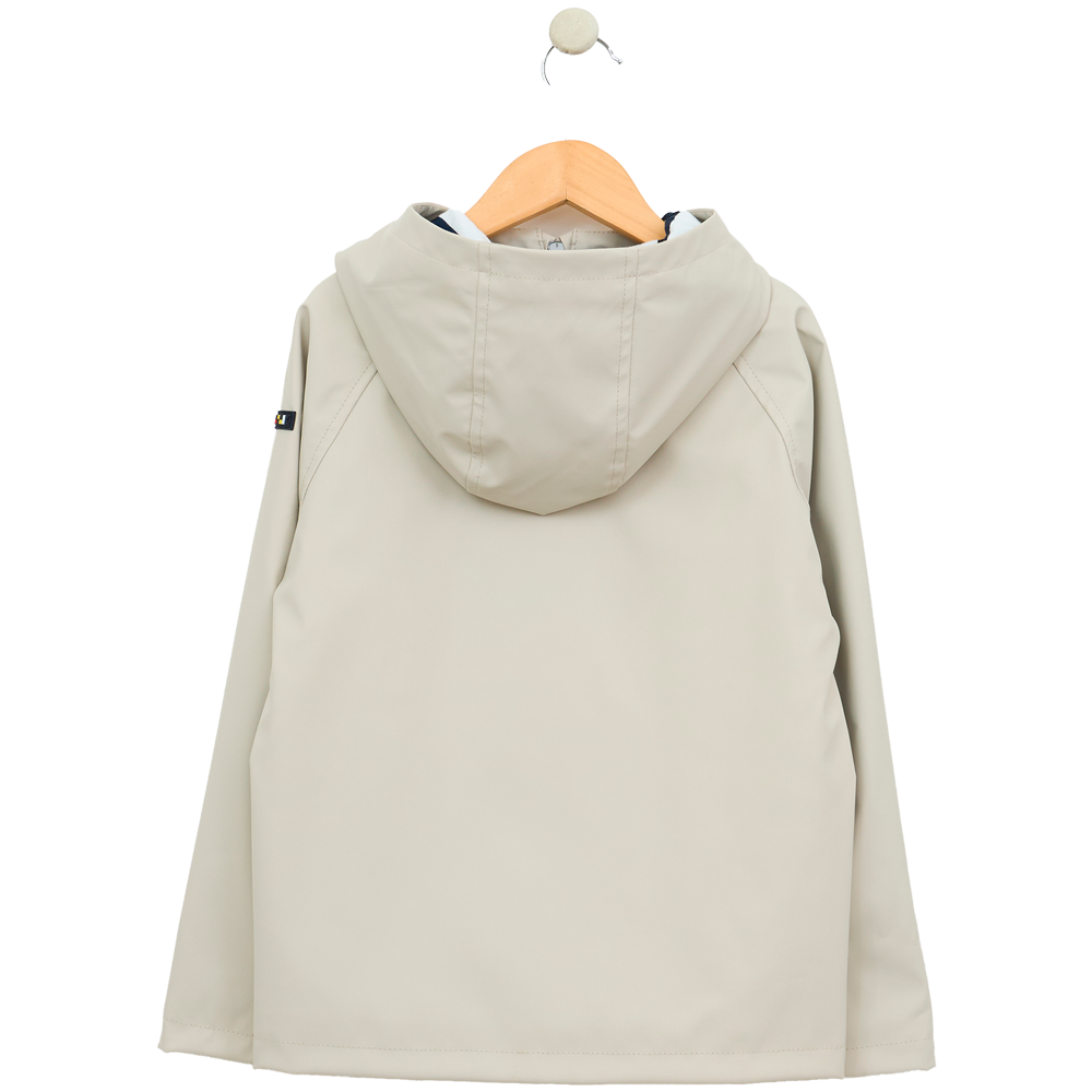 Chubasquero impermeable de corte recto y manga ranglán confeccionada por Batela. Este chubasquero marinero cuenta con bolsillos de plastón con botones y cremallera central.