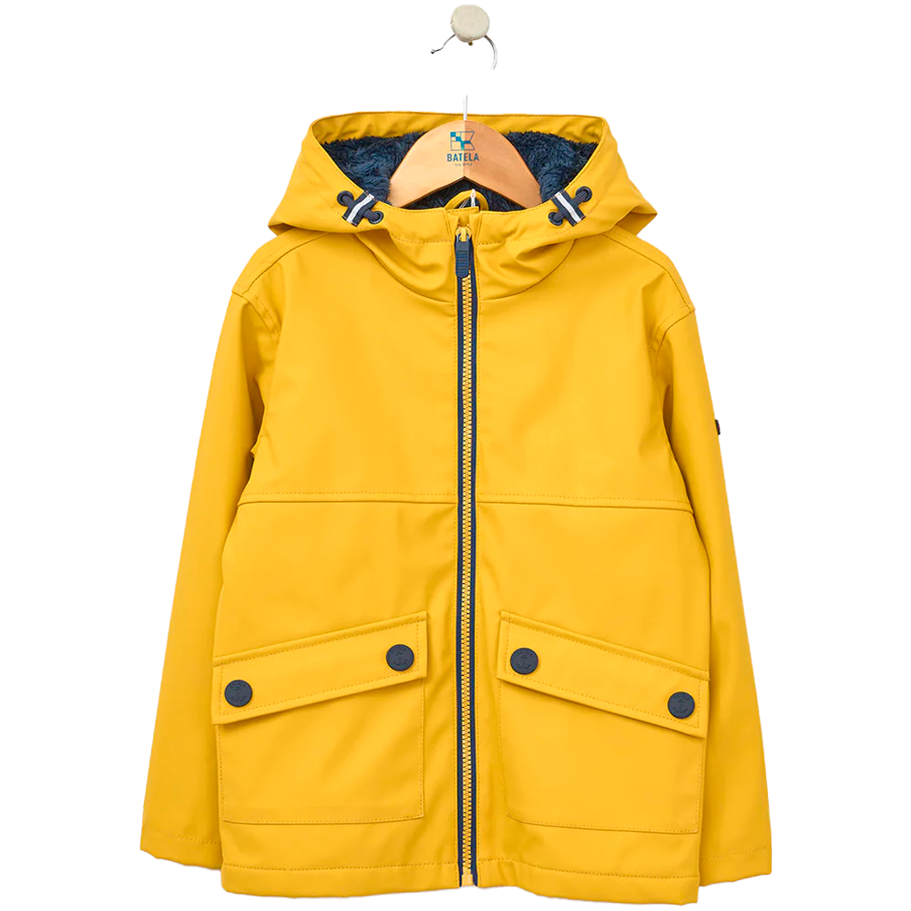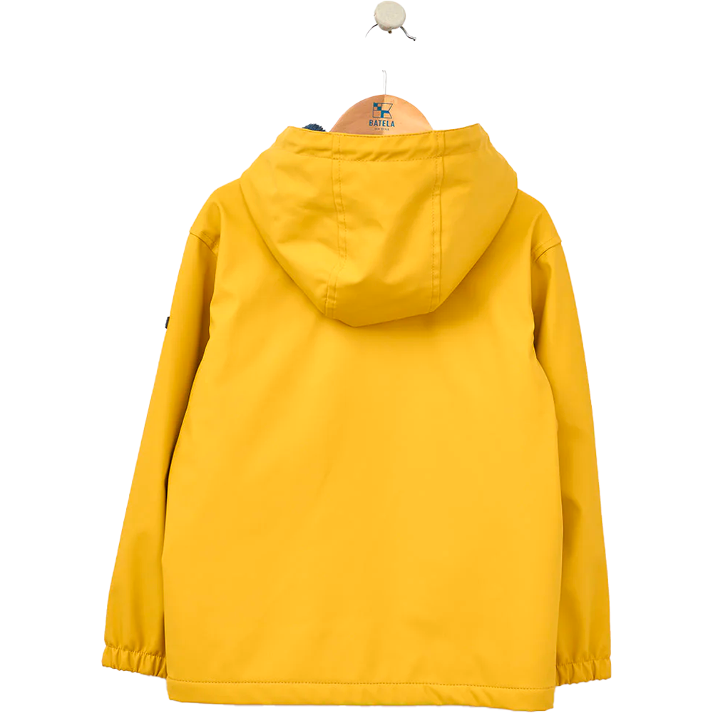 Chubasquero junior de estilo náutico confeccionado por Batela con poliuretano impermeable. Este chubasquero protege contra lluvia y viento siendo perfecto para los días de frío gracias a su forro interior de pelo suave. Su diseño incluye bolsillos frontales tipo parche con solapa y cierre de corchetes con un detalle de anclas para que los más pequeños guarden sus objetos.