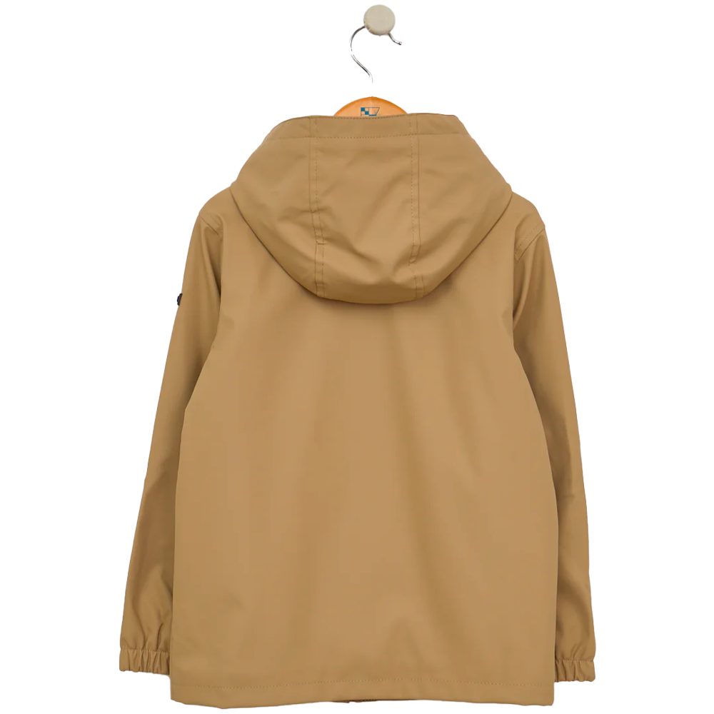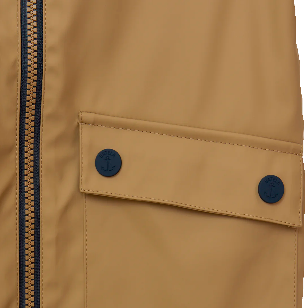 Chubasquero junior de estilo náutico confeccionado por Batela con poliuretano impermeable. Este chubasquero protege contra lluvia y viento siendo perfecto para los días de frío gracias a su forro interior de pelo suave. Su diseño incluye bolsillos frontales tipo parche con solapa y cierre de corchetes con un detalle de anclas para que los más pequeños guarden sus objetos.