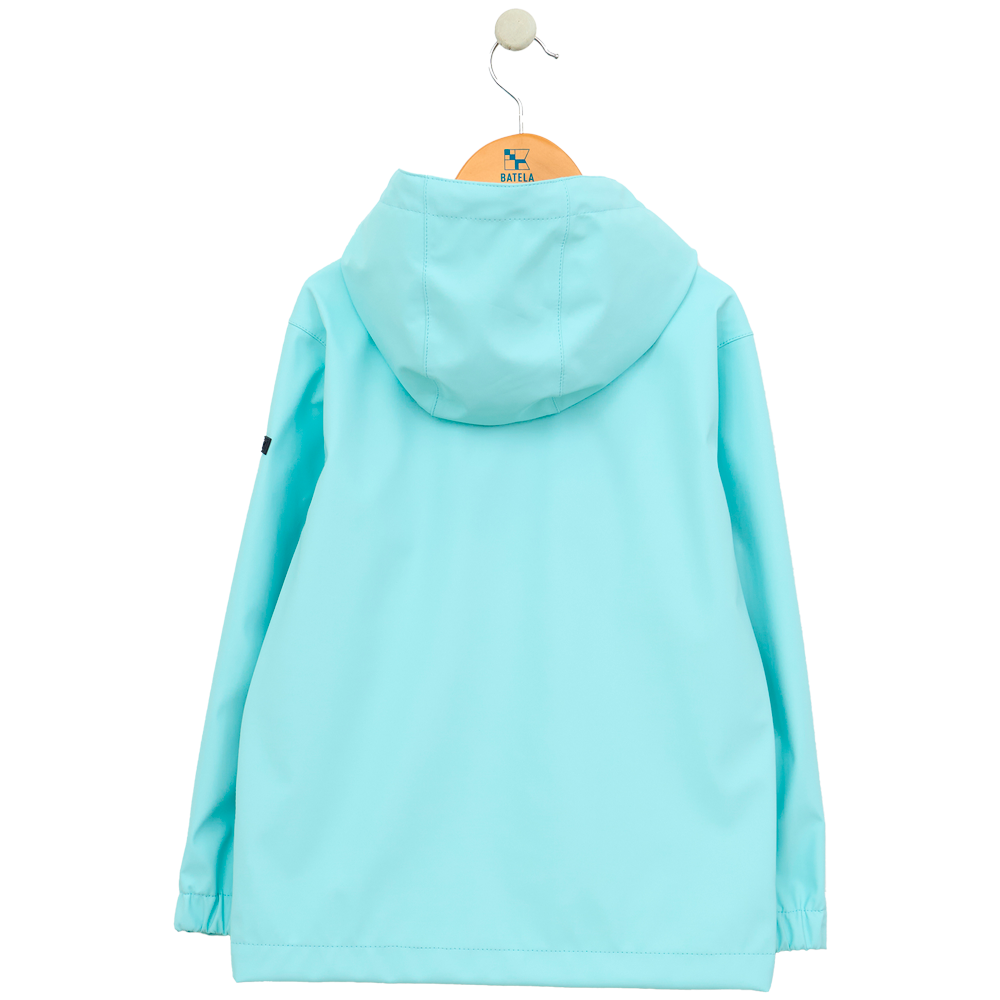 Chubasquero junior unisex de estilo náutico confeccionado por Batela con poliuretano impermeable. Este chubasquero sin forro protege contra la lluvia y viento siendo perfecto para la primavera . Su diseño incluye bolsillos frontales tipo parche con solapa y cierre de corchetes para que los más pequeños guarden sus objetos.