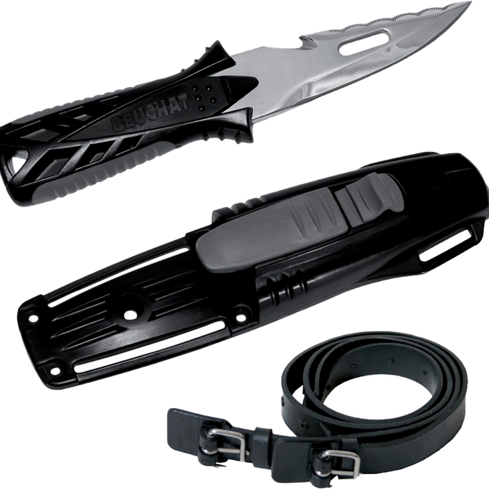 Cuchillo de la marca Beuchat Mini Legend. Cuenta con una hoja de doble filo de 23 x 4 mm y es de acero inoxidable lleva incorporados cortahilos y abregrilletes. Además tiene una dunde de doble cierra.
