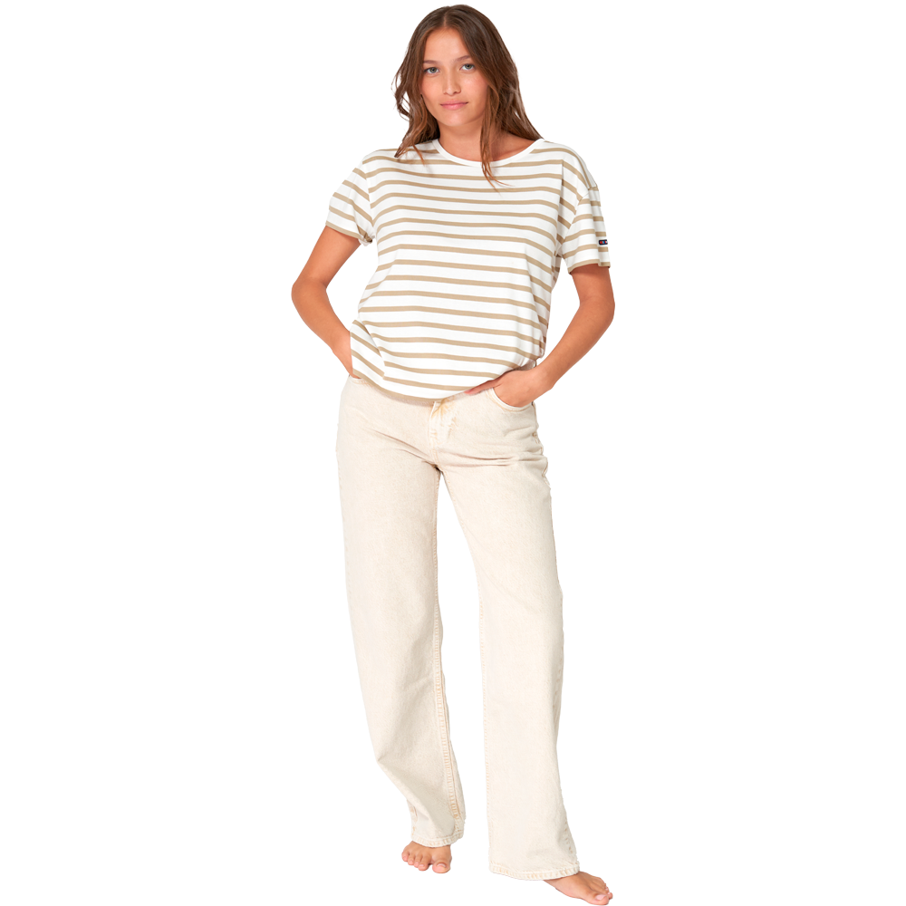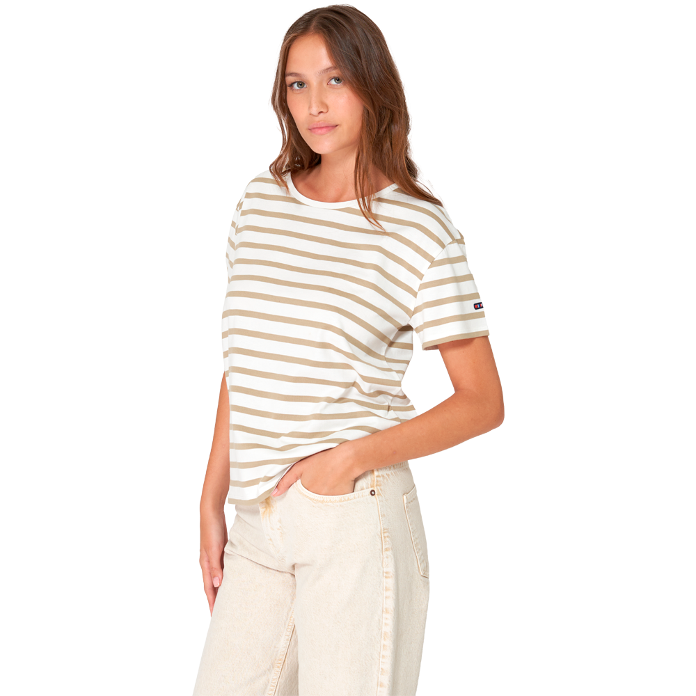 Camiseta marsellesa a rayas con cuello redondo confeccionada por Batela. Esta camiseta de algodón 180 gramos y manga corta cuenta con rayas cruzadas en las mangas.