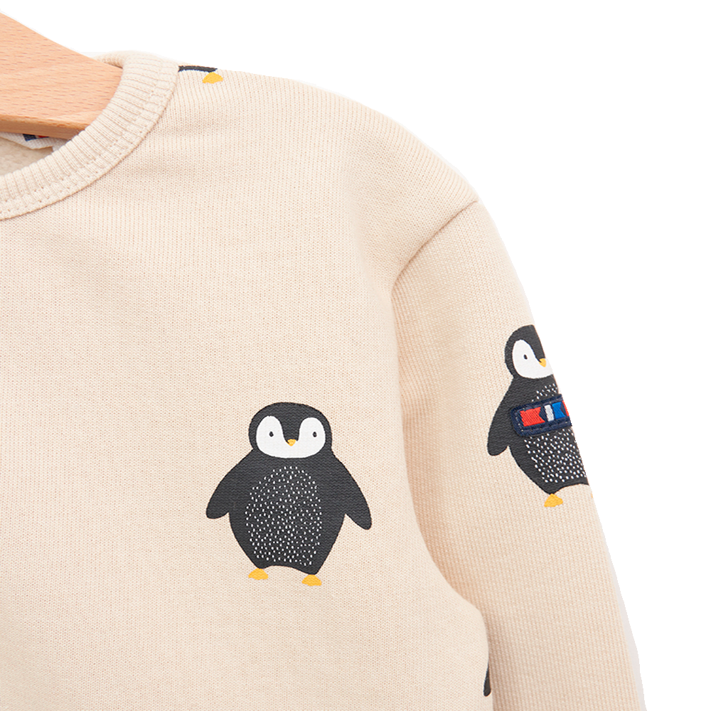 Sudadera práctica y encantadora para bebé con estampado de pingüinos. Fabricada con tejido de felpa, no solo ofrece un diseño adorable sino también una gran funcionalidad. Los botones a presión en la espalda facilitan el vestir y desvestir al bebé, mientras que el ribete de canalé en el cuello y los puños asegura un ajuste cómodo y seguro.
