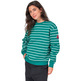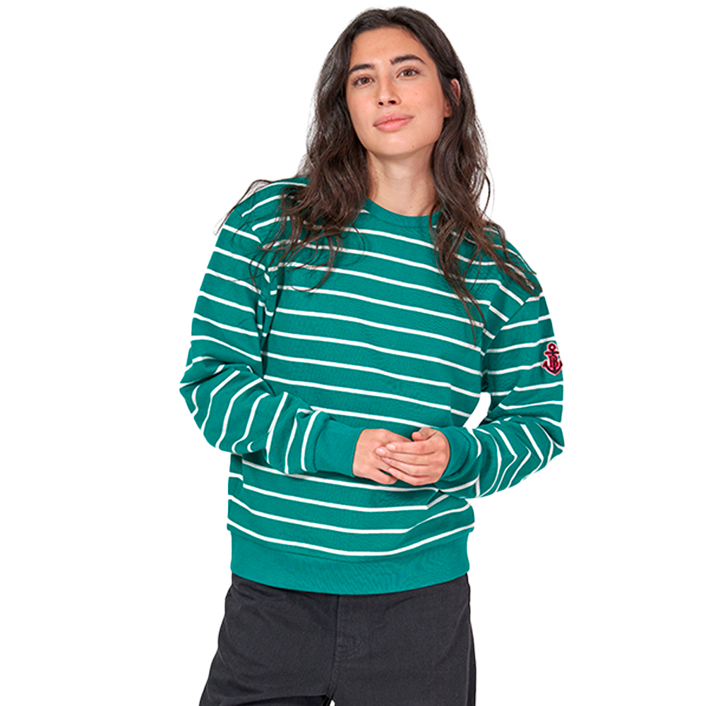 Sudadera marinera para mujer fabricada con tejido de felpa 100% algodón de 320gr, ofrece una textura suave y una calidez ideal para los días más frescos. El diseño presenta rayas características del estilo náutico y un detalle distintivo de parche en una manga, añadiendo un toque de originalidad.